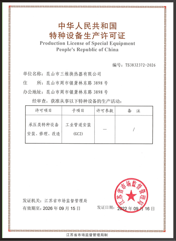 A2壓力容器制造許可證,D1/D2壓力容器設(shè)計(jì)許可證;GC2管道安裝許可證;ASME U/NB鋼印;ISO9001、ISO45001、ISO14001體系認(rèn)證證書(shū)等。
